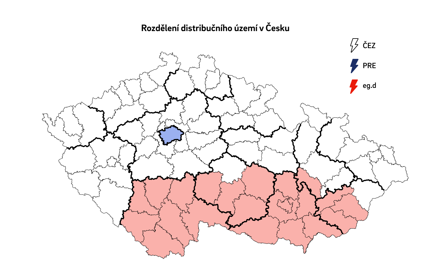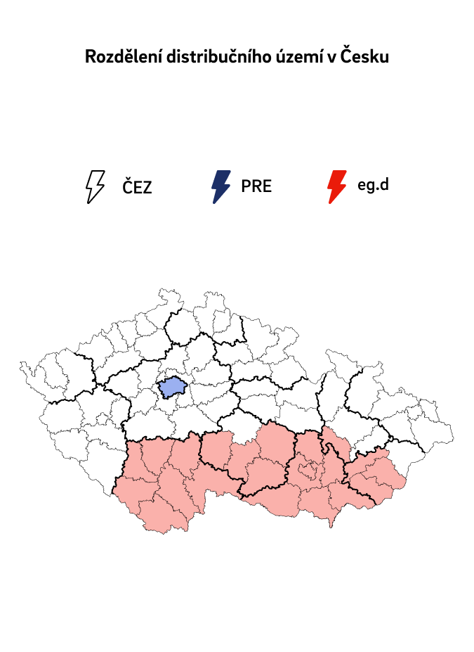 - EG.D – spravuje jižní Čechy, jižní Moravu a části Zlínského a Olomouckého kraje,